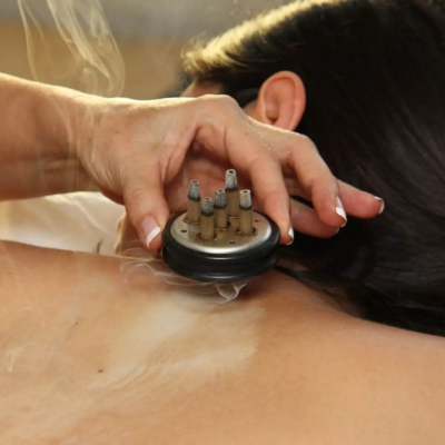al cuerpo mediante la combustión de la hierba de artemisa (moxa) para estimular puntos específicos,